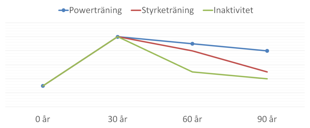Den blåa kurvan visar hur vi kan bromsa förlusten av muskelmassa markant genom så kallad Power-träning. Är du nyfiken på att lära dig mer om Power-träning är du varmt välkommen att höra av dig!